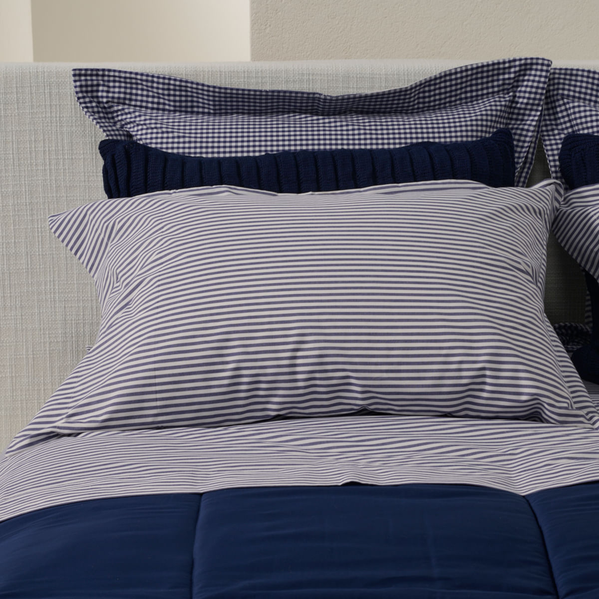 Fronhas com listras e três abas, trazendo um acabamento refinado: